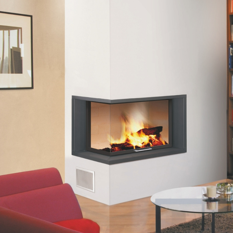 Modèle présenté avec un foyer Multi-Vision L80 E+, possibilité d’avoir une vitre latérale à droite ou à gauche en fonction de l’implantation de la cheminée dans votre pièce.